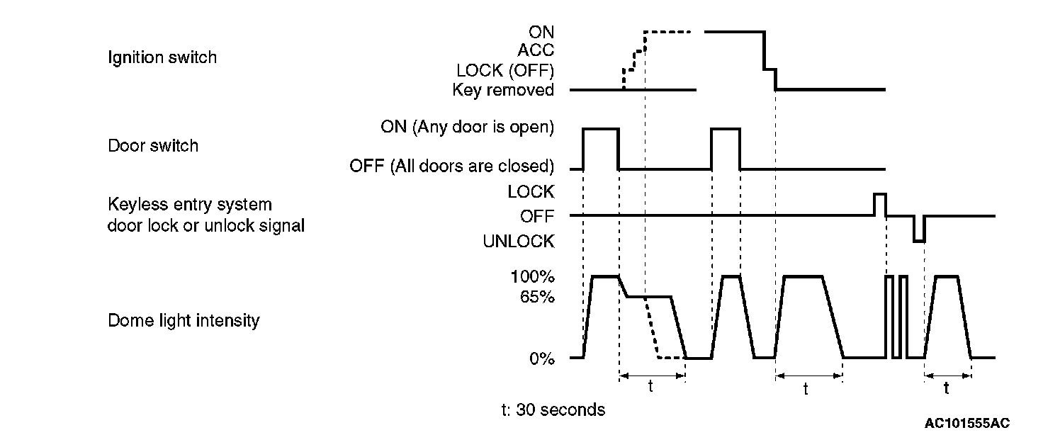 - When a door is opened to get on or get off the vehicle with the ignition switch off, the dome light lights up at a luminance of 100 percent. When a door is closed, the dome light dims at a luminance of 65 percent, and goes off 30 seconds later. However if the ignition switch is turned ON or if all doors are locked while they are closed, the dome light will go off at that point.