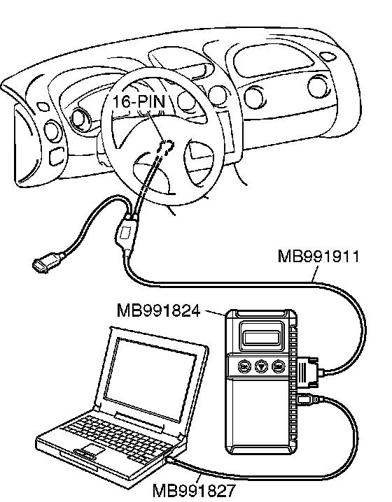 CAUTION: To prevent damage to scan tool MB991958, always turn the ignition switch to the "LOCK" (OFF) position before connecting or disconnecting scan tool MB991958.