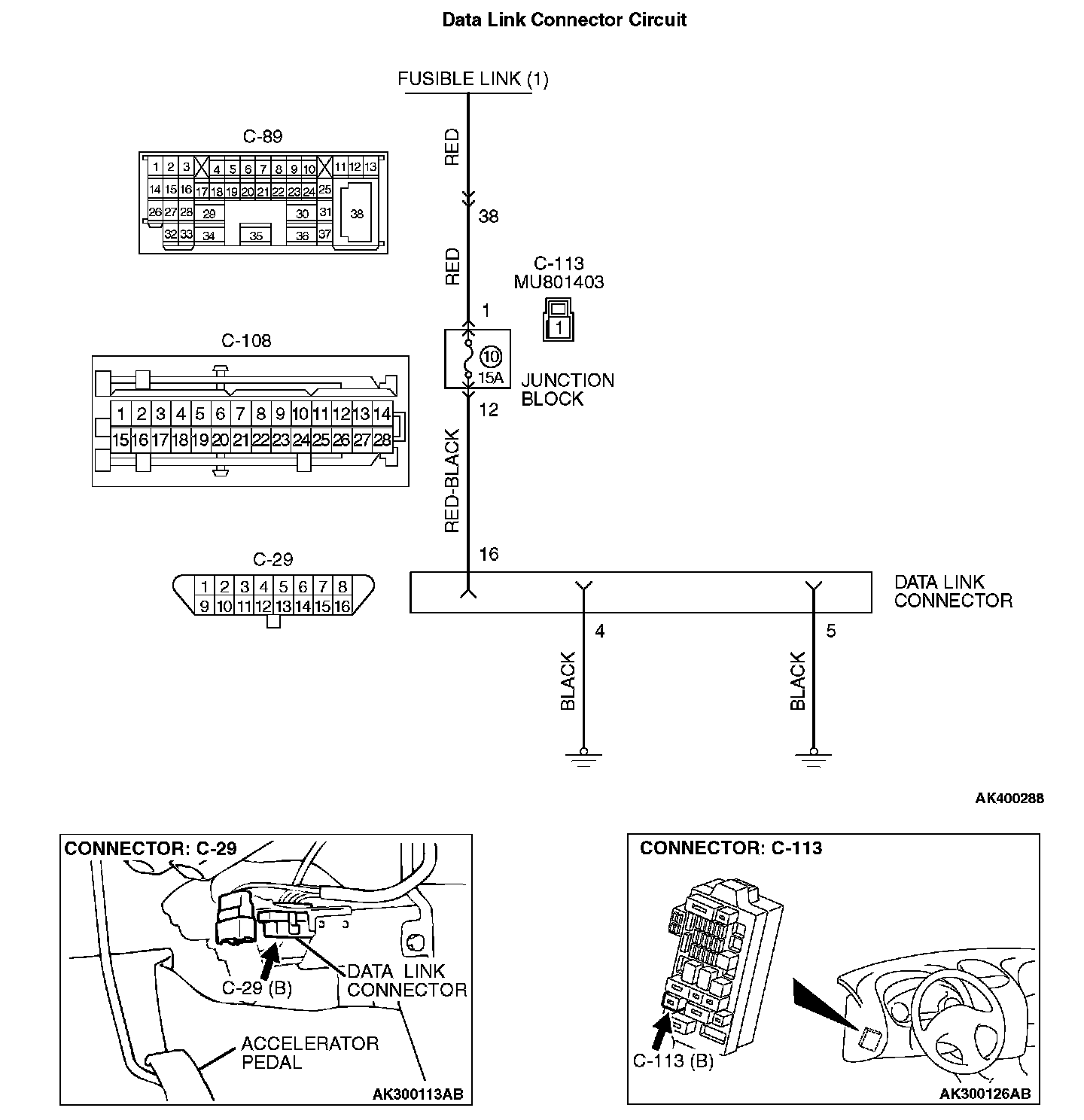 NO: Check harness connectors C-108, C-113 and C-89 at intermediate connector for damage and repair or replace as required. Refer to Harness Connector Inspection. If intermediate connectors are in good condition, repair harness wire between fusible link 1 and data link connector C-29 terminal 16 because of open circuit. Then confirm that the malfunction symptom is eliminated.