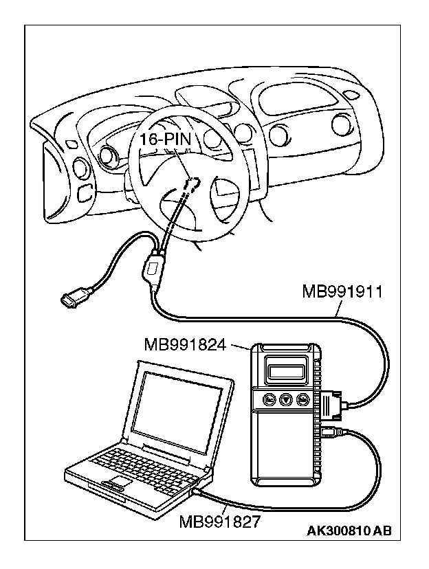 CAUTION: To prevent damage to scan tool MB991958, always turn the ignition switch to the "LOCK" (OFF) position before connecting or disconnecting scan tool MB991958.