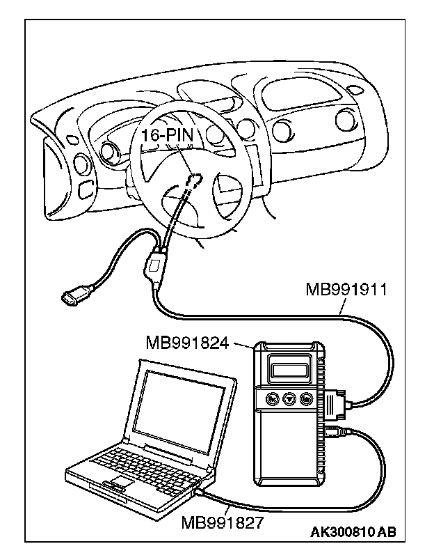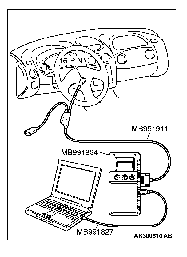 CAUTION: To prevent damage to scan tool MB991958, always turn the ignition switch to the "LOCK" (OFF) position before connecting or disconnecting scan tool MB991958.