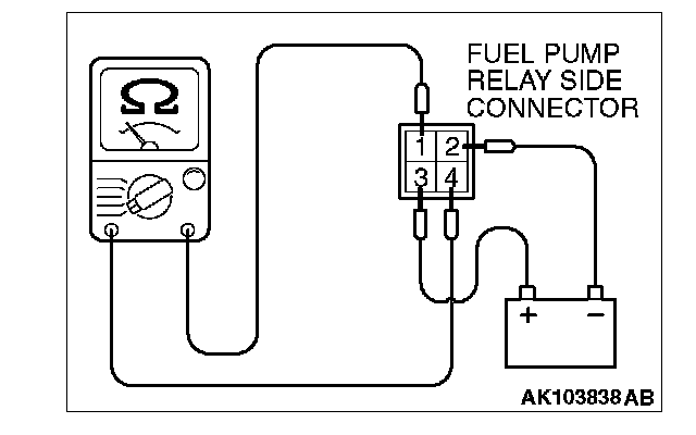 4. Check the continuity between the each fuel pump relay terminals No. 1 and No. 4 while connecting and disconnecting the jumper wire at the negative battery terminal.