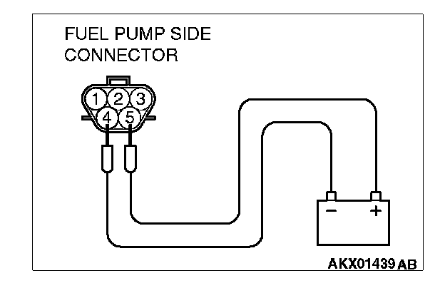 2. Use jumper wires to connect fuel pump connector terminal No. 5 to the positive battery terminal and terminal No. 4 to the negative battery terminal.
