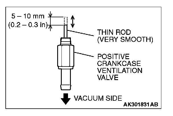 POSITIVE CRANKCASE VENTILATION VALVE CHECK1. Hold the positive crankcase ventilation (PCV) valve with the vacuum side down. Insert a thin rod and using light pressure, depress the end of the PCV valve spring by 5 - 10 mm (0.2 - 0.3 inch). Release pressure on the rod to see if the PCV valve spring will lift the rod to its original position.