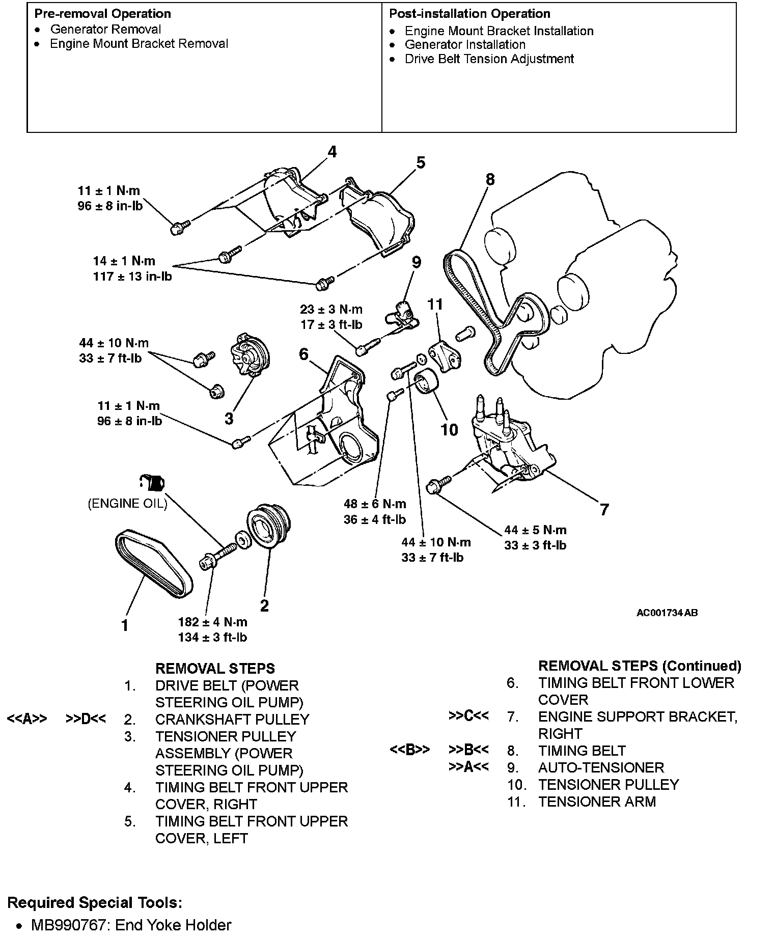 Install the timing belt on each sprocket and pulley in the following sequence. Do not leave the belt slack between each sprocket and pulley.