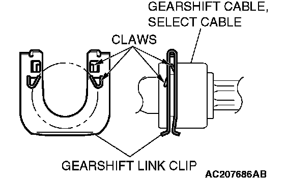 CAUTION: Insert thoroughly the gearshift link clip, shift cable and select cable until they click in place.