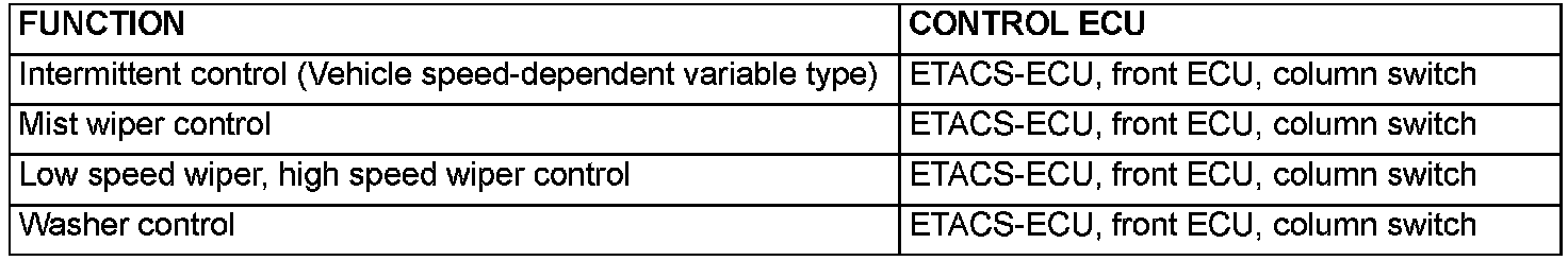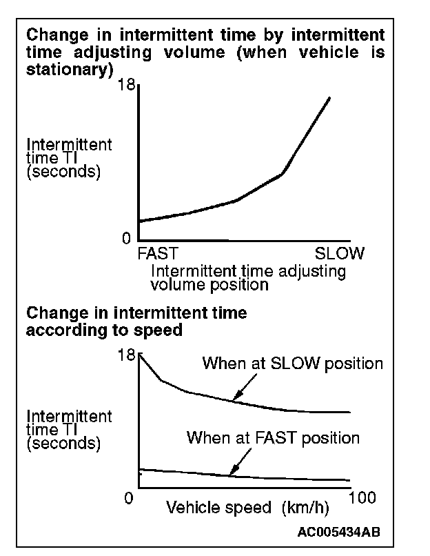 The ETACS-ECU calculates the intermittent time according to the vehicle speed calculated from the windshield wiper intermittent time adjusting knob and vehicle speed signal (ECM