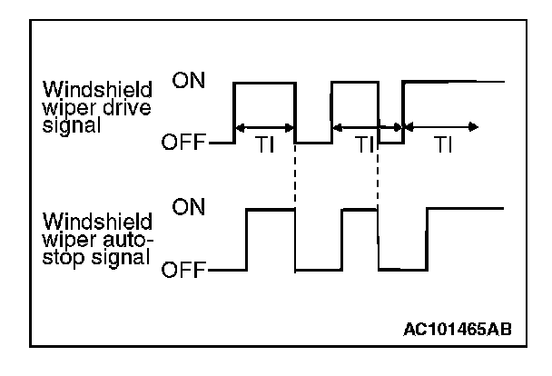 The front ECU determines the intermittent time TI from the input SWS data signal, and turns ON the windshield wiper drive signal. When the wiper is at the STOP position, the windshield wiper auto-stop signal goes OFF to turn OFF the windshield wipe drive signal. After the intermittent time TI seconds from when the windshield wiper drive signal turned ON, the windshield wiper drive signal is turned ON again and the above operation is repeated.