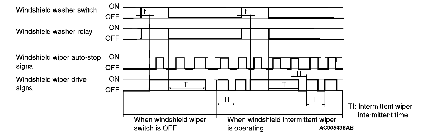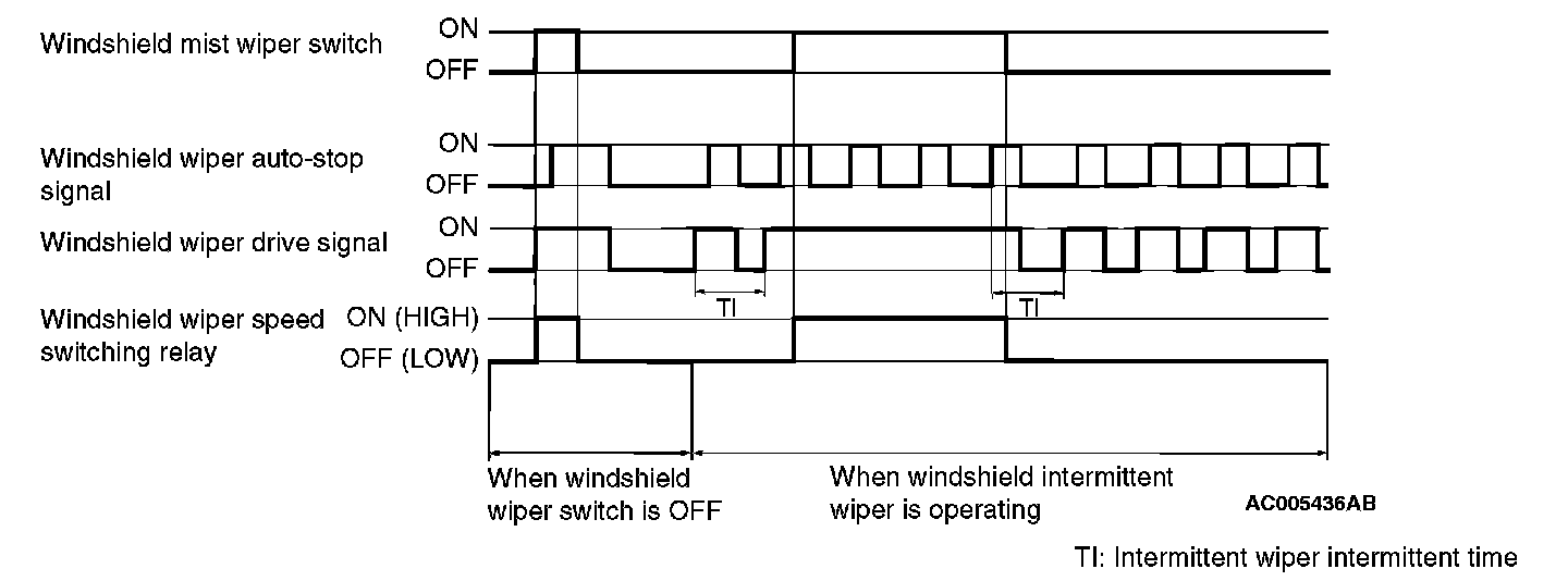 At the point the windshield mist switch is turned ON, if the windshield wiper has been operating intermittently, the same operations as the above will be performed while the windshield mist wiper switch is ON. After the windshield mist wiper switch goes OFF, the intermittent operations will be set again TI seconds after the windshield wiper auto-stop signal is turned ON last.