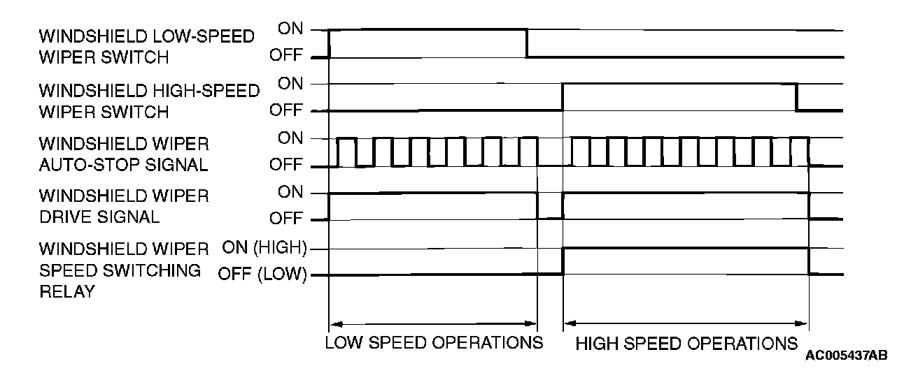 When the ignition switch is at the ACC or ON position, if the windshield low speed wiper switch of the column switch is turned ON, the front ECU turns ON the windshield wiper drive signal, turns OFF (LO) the windshield wiper speed relay, and operates the windshield wiper at low speed. Next, when the windshield high speed wiper switch is turned ON, the windshield wiper drive signal is turned ON, the windshield wiper speed switching relay is turned ON (HI), and the windshield wiper is operated at high speed.