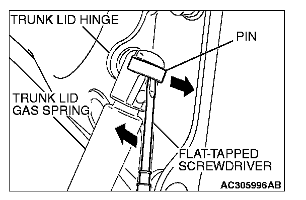 As shown in the figure, slide the pin upward, then remove the trunk lid gas spring in the direction of the arrow to unscrew the trunk lid hinge.