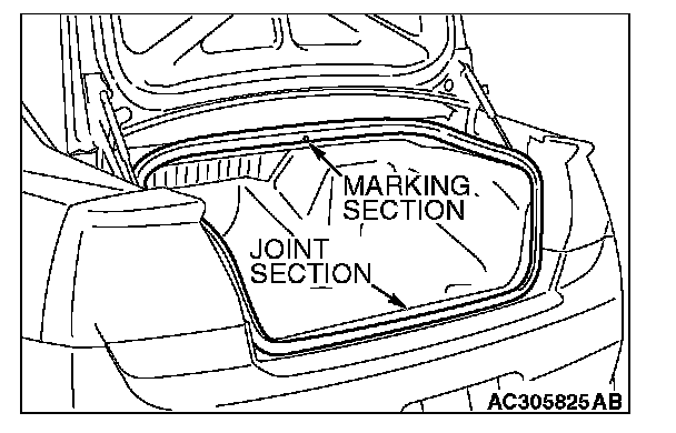 Install the trunk lid weatherstrip so that the marking and the joint are aligned with the body center line.