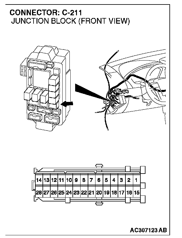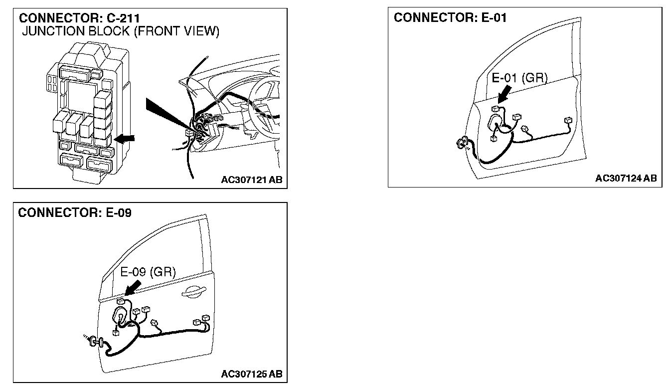 STEP 2. Check the remote controlled mirror (RH) connector E-01 and junction block connector C-211 for loose, corroded or damaged terminals, or terminals pushed back in the connector.