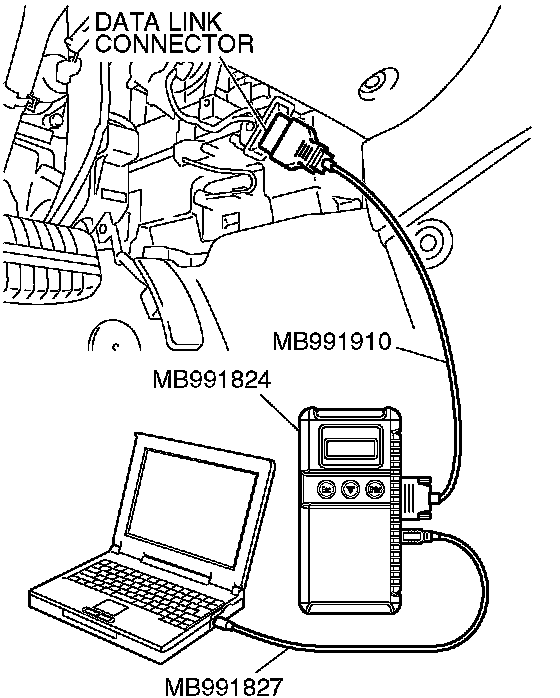 CAUTION: To prevent damage to scan tool MB991958, always turn the ignition switch to the LOCK (OFF) position before connecting or disconnecting scan tool MB991958.