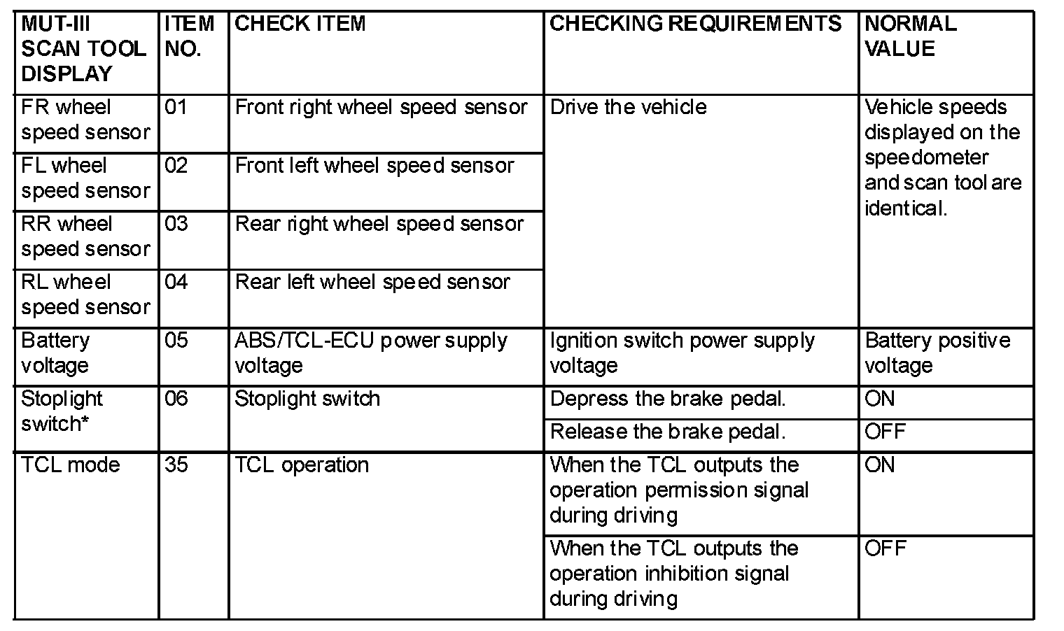 NOTE: Since the TCL is controlled with the same ABS/TCL-ECU used to control the ABS, the stoplight switch check item (No.6) used only for the ABS also appear.
