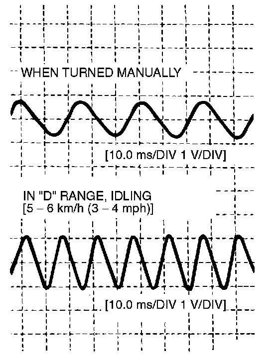 NOTE: The output waveform is low when the wheel speed is low. Similarly, it will be higher as the wheel speed increases. Waveform may also be observed by caving the vehicle.