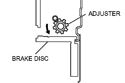 4. Use a flat-tip screwdriver to turn the adjuster in the direction of the arrow (the direction which expands the shoe) so that the disc will not rotate by hand. Return the adjuster five notches in the direction opposite to the direction of the arrow.