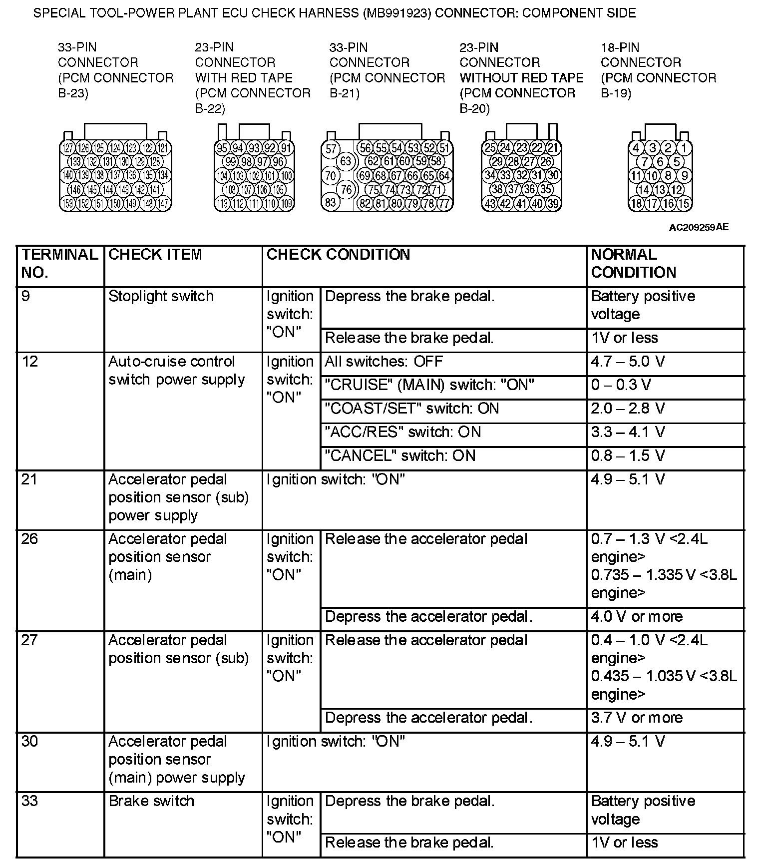 2. Measure the voltages between the check connector terminals of special tool MB991923 and ground terminals 63 or 76.