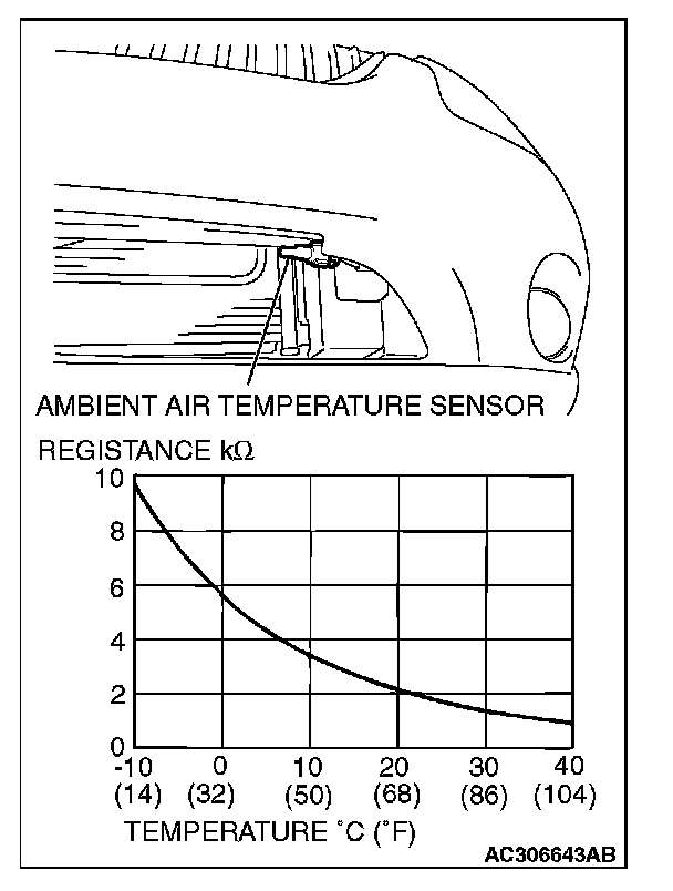 AMBIENT AIR TEMPERATURE SENSOR CHECKThe ambient air temperature sensor should be checked in situ. Once the sensor is removed, it is rendered unserviceable. Measure the resistance between the sensor terminals under at least two temperatures. The resistance values should meet the values shown.