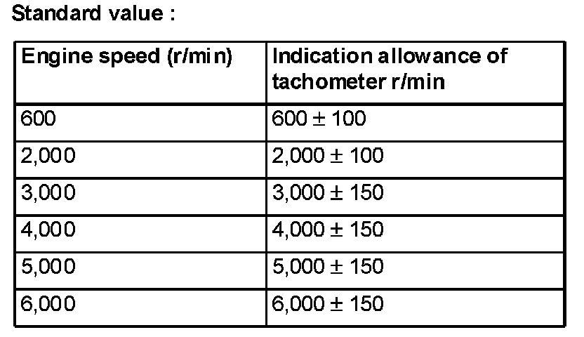 7. Compare the engine speed shown in the scan tool with that shown on the tachometer. The engine speeds shown on the tachometer should correspond to the table.
