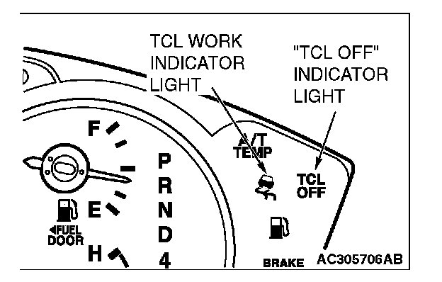 TCL INDICATOR LIGHT CHECK1. Check that the "TCL OFF" indicator light and the TCL work indicator light illuminate for three seconds when the ignition switch is turned to the "ON" position.