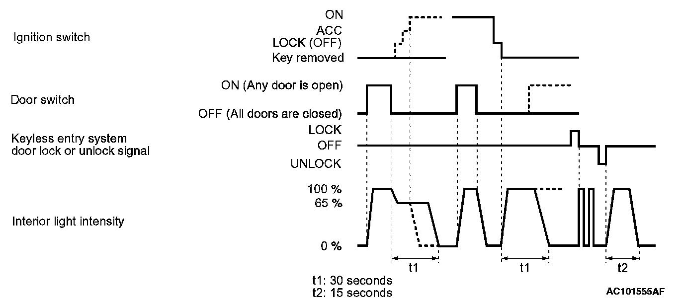 NOTE: The dotted lines indicate that lighting mode when the ignition switch is turned ON, door is locked, or any door is opened during the timer illumination time.