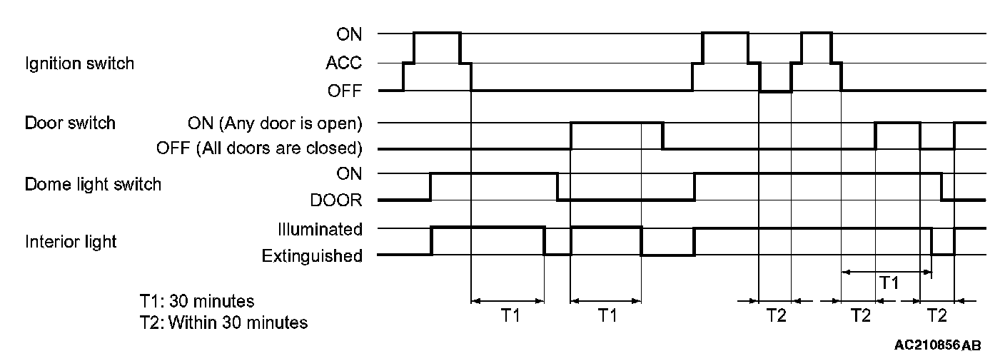 - When the ignition switch is turned off and one of the door switches remains open for 30 minutes continuously, the interior lights will go off automatically.