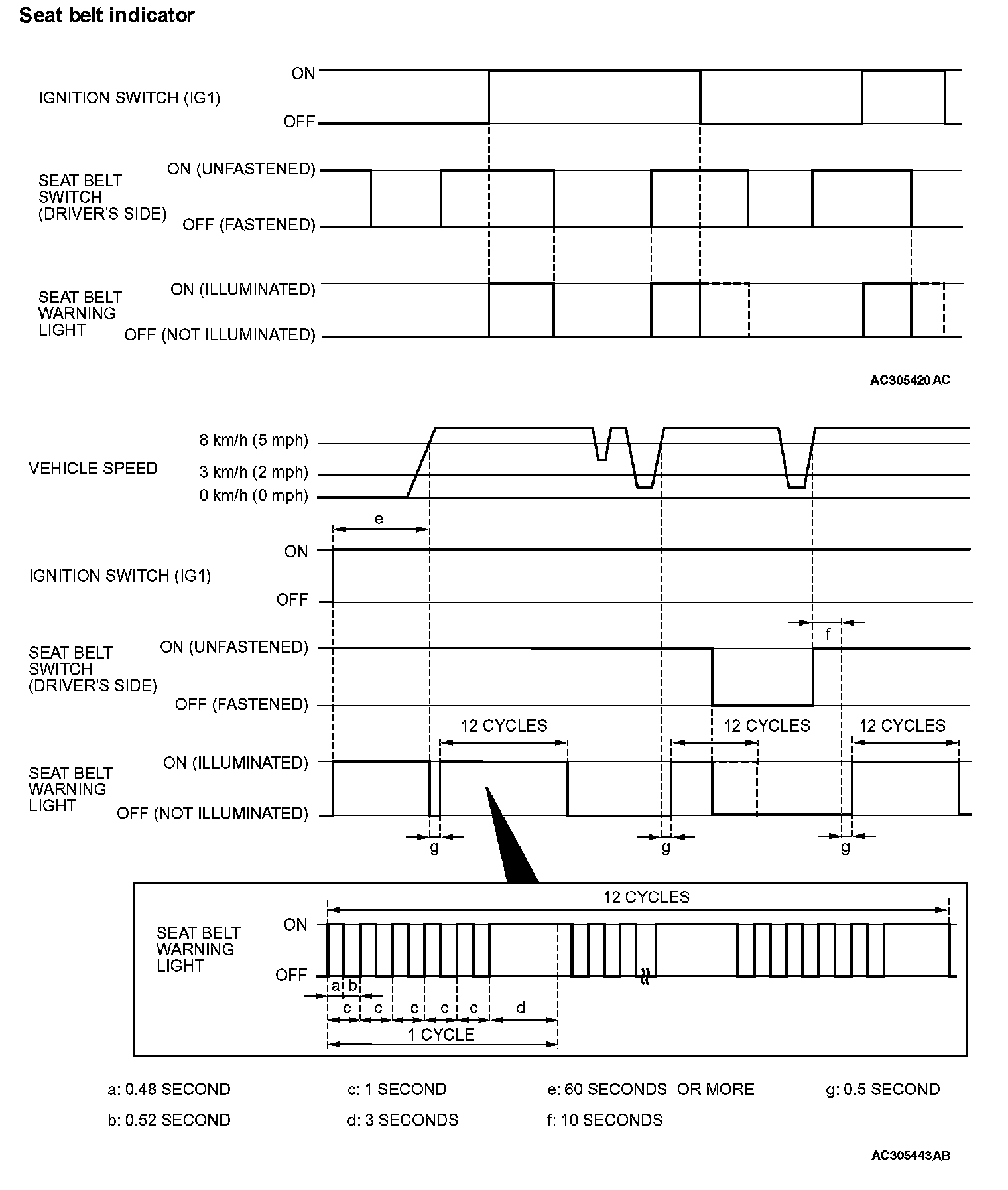 b. The seat belt switch has been turned on (driver's seat belt has not been fastened) for at least ten seconds while the ignition switch has been turned "ON" and the vehicle speed has been 8 km/h (5 mph) or more.