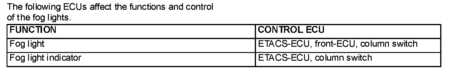 At the same time that the fog lights are illuminated, the ETACS-ECU sends a signal to illuminate the fog light indicator via the CAN bus line. The combination meter receives the transmitted signal and turns the fog light indicator on and off.