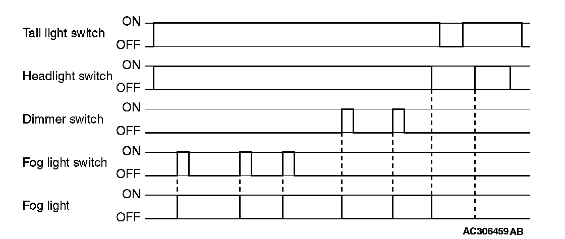 The fog lights will be switched off when any of the following conditions is met. The fog lights will also be switched off automatically by headlight automatic shutoff function.