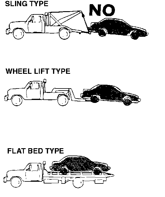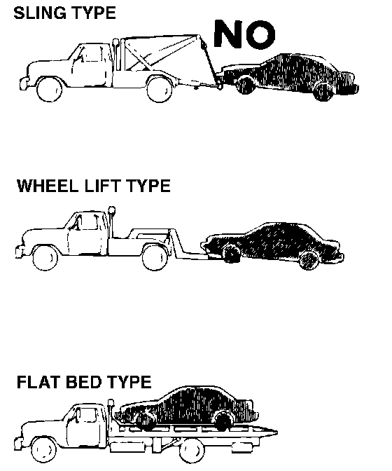 CAUTION: This vehicle cannot be towed by a wrecker using sling- type equipment; otherwise the bumper may become deformed. If this vehicle is towed, use wheel lift or flat bed equipment.