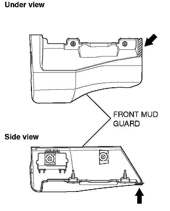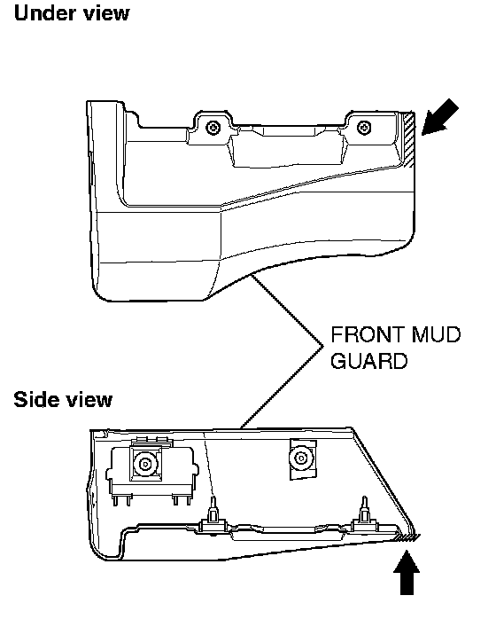 - If the assembling support area contacts with the front mud guard (arrow area as shown in the illustration), the front mud guard will be damaged. Slide the assembling support area to the front of the vehicle slightly to prevent the damage.