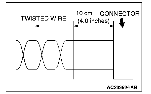 - If the connector or wire on the main bus line or the sub-bus wire is replaced, the strand end of the twisted wire should be within 10 cm (4 inches) from the connector. If it exceeds 10 cm (4 inches), twist the wiring harness just like the original twisted wire. If the strand end exceeds 10 cm (4 inches), noise suppression is deteriorated, causing a communication error.