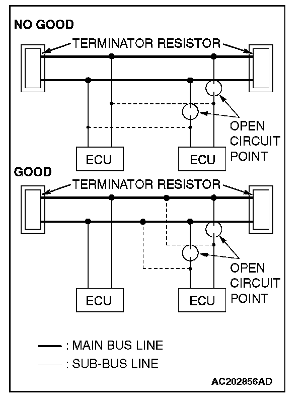 - If a sub-bus line is repaired, splice a new wire directly into the main bus line. If a new wire is spliced into the sub-bus line, which is connected to another device, the CAN communication will be disabled.