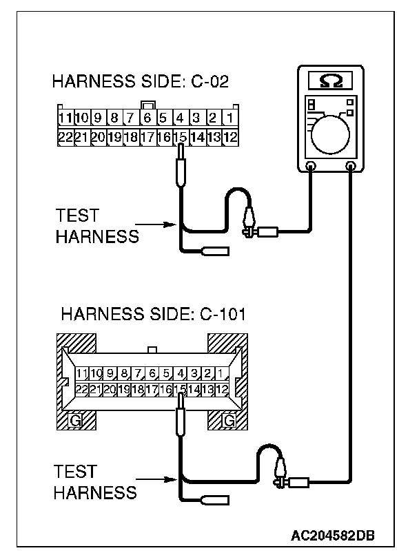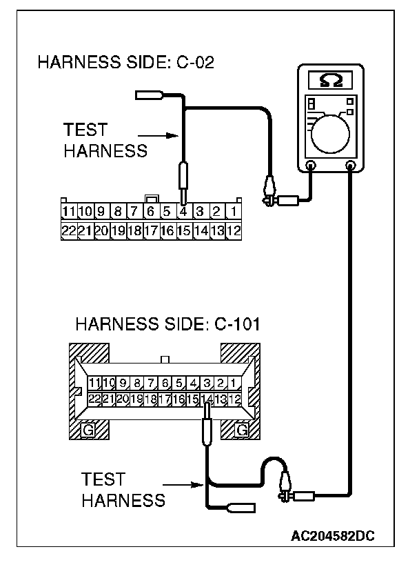 1. Disconnect joint connector (3) C-02 and combination meter connector C-101, and measure the resistance between each wiring harness side connector.