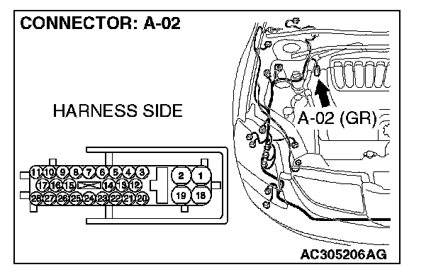 STEP 9. Check ABS-ECU connector A-02 and powertrain control module connector B-19 for loose, corroded or damaged terminals, or terminals pushed back in the connector.