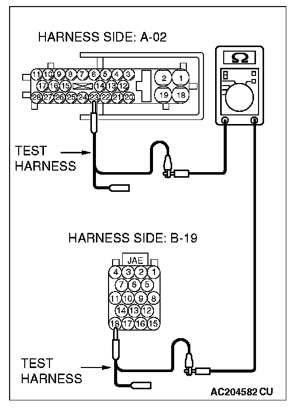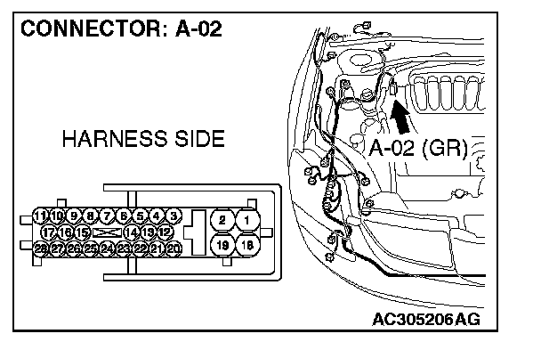 1. Disconnect ABS-ECU connector A-02 and powertrain control module connector B-19, and measure the resistance between each wiring harness side connector.