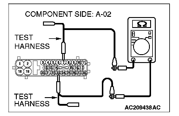 2. Measure the resistance between ABS-ECU connector terminals 7 and 23.
