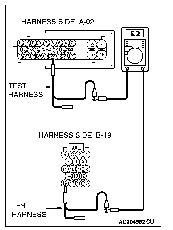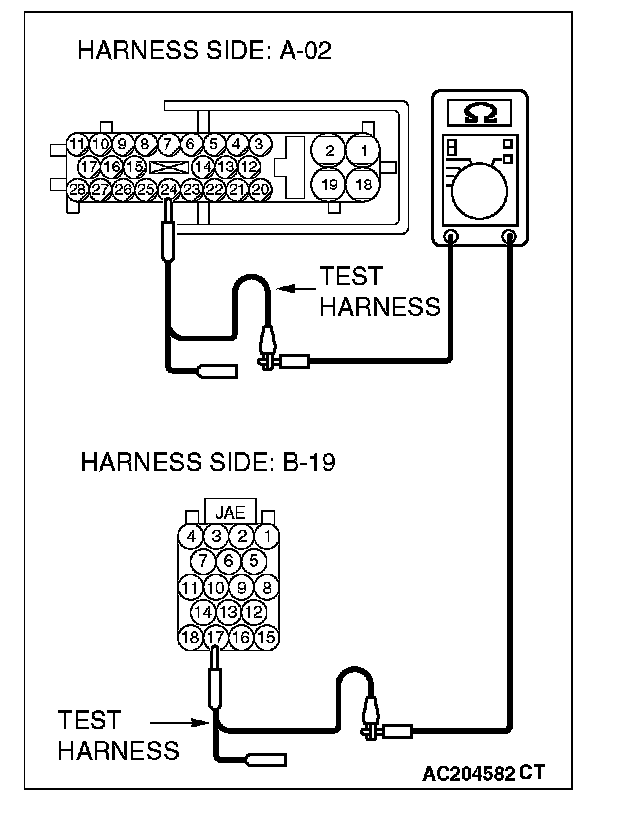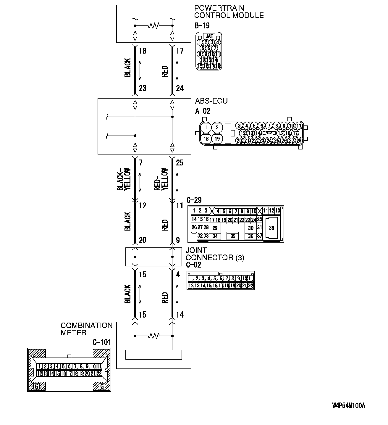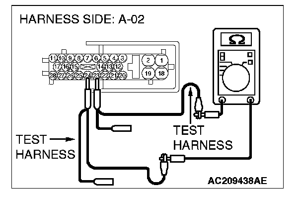 1. Disconnect ABS-ECU connector A-02 and powertrain control module connector B-19, and measure the resistance between each wiring harness side connector.