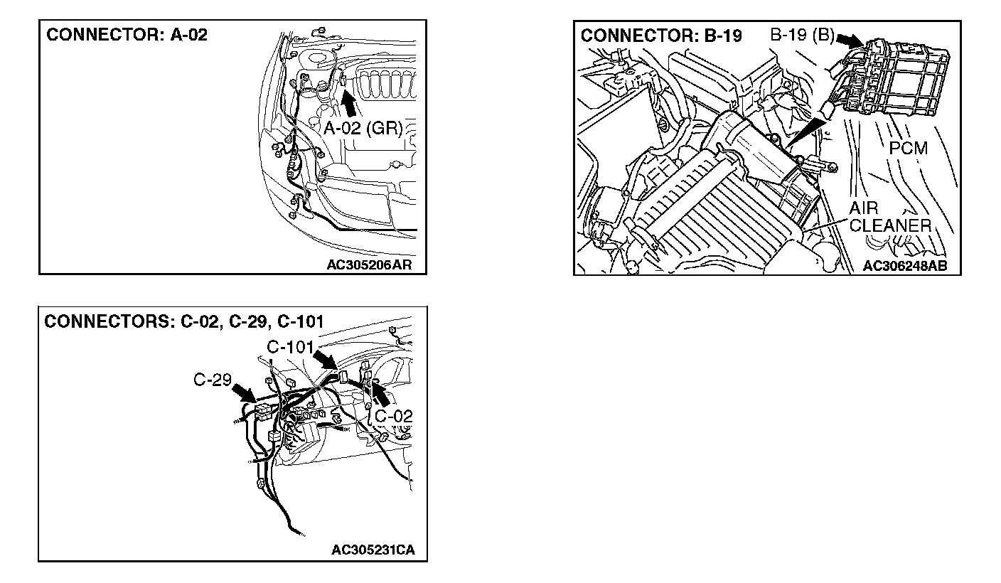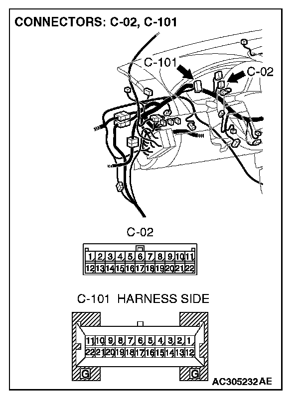 STEP 3. Check joint connector (3) C-02 and combination meter connector C-101 for loose, corroded or damaged terminals, or terminals pushed back in the connector.