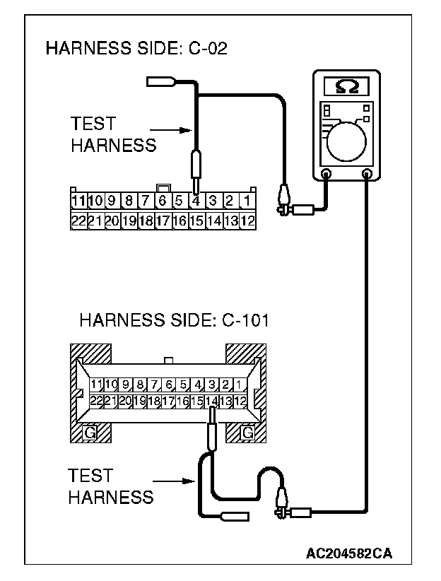 1. Disconnect joint connector (3) C-02 and combination meter connector C-101, and measure the resistance between each wiring harness side connector.