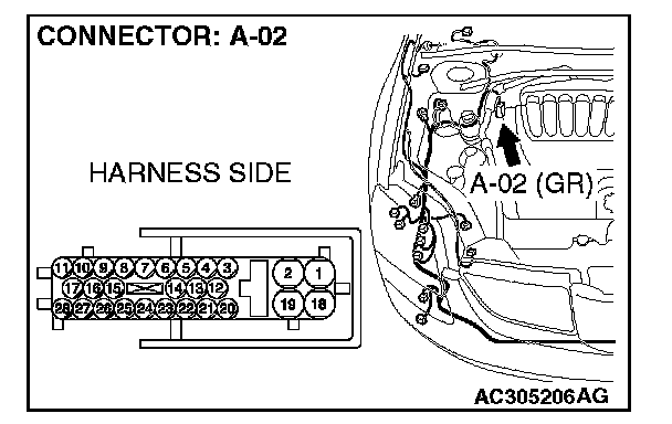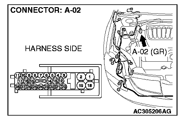 1. Disconnect ABS-ECU connector A-02, and measure the resistance at the wiring harness side of ABS-ECU connector A-02.