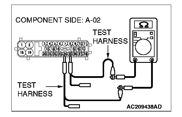 1. Disconnect ABS-ECU connector A-02, and measure the resistance at the component side of ABS-ECU connector A-02.