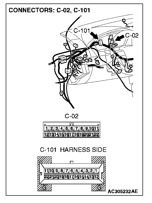 STEP 1. Check joint connector (3) C-02 and combination meter connector C-101 for loose, corroded or damaged terminals, or terminals pushed back in the connector.