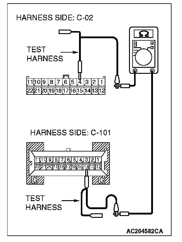 1. Disconnect joint connector (3) C-02 and combination meter connector C-101, and measure the resistance between each wiring harness side connector.