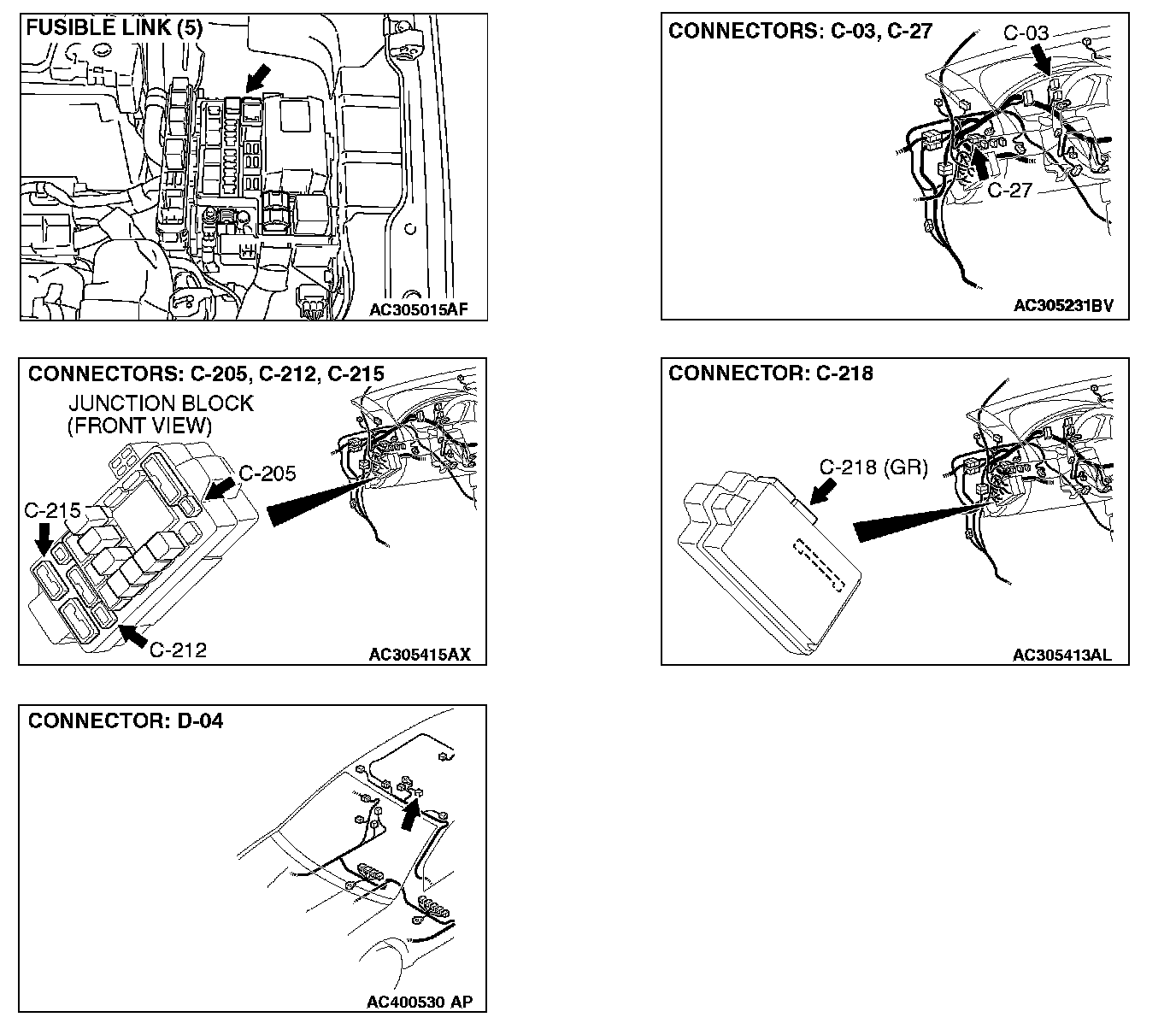 NOTE: Also check junction block connectors C-212, C-215 and intermediate connector C-27 for loose, corroded, or damaged terminals, or terminals pushed back in the connector. If junction block connector C-212, C-215 or intermediate connector C-27 is damaged, repair or replace the damaged component(s) as described in Harness Connector Inspection.