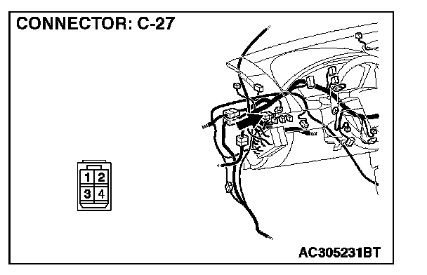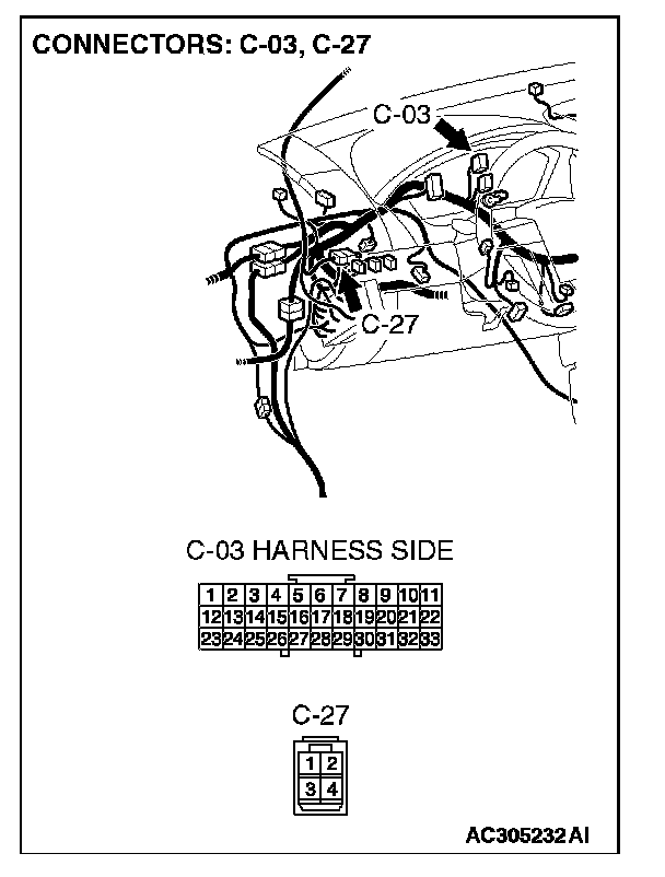NOTE: Also check intermediate connector C-27 and joint connector C-03 for loose, corroded, or damaged terminals, or terminals pushed back in the connector. If intermediate connector C-27 or joint connector C-03 is damaged, repair or replace the damaged component(s) as described in Harness Connector Inspection.