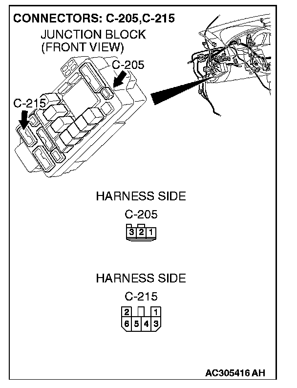 NOTE: Also check junction block connectors C-215 and C-205 for loose, corroded, or damaged terminals, or terminals pushed back in the connector. If junction block connector C-215 or C-205 is damaged, repair or replace the damaged component(s) as described in Harness Connector Inspection.