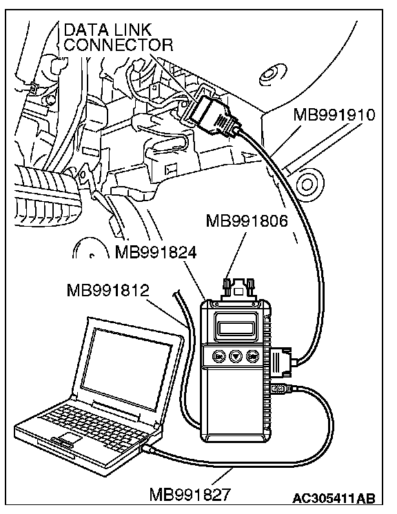 CAUTION: To prevent damage to scan tool MB991958, always turn the ignition switch to the "LOCK" (OFF) position before connecting or disconnecting scan tool MB991958. Connect special tool MB991910 before connecting special tool MB991812. Be sure to connect special tool MB991806 after turning on special tool MB991824.