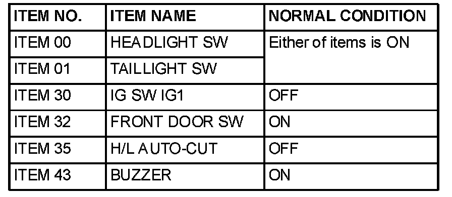 Q: Does scan tool MB991958 display "HEADLIGHT SW", "TAILLIGHT SW", "IG SW IG1", "FRONT DOOR SW", "H/L AUTO-CUT" and "BUZZER" as normal condition?